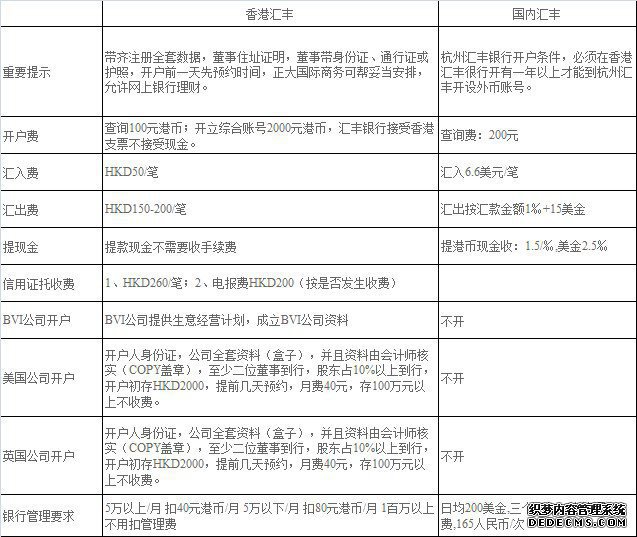 香港汇丰银行与国内汇丰银行开户情况相比较: